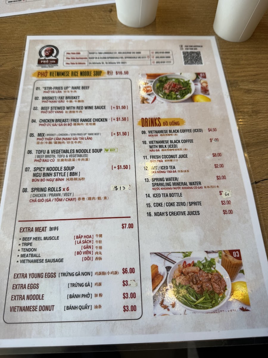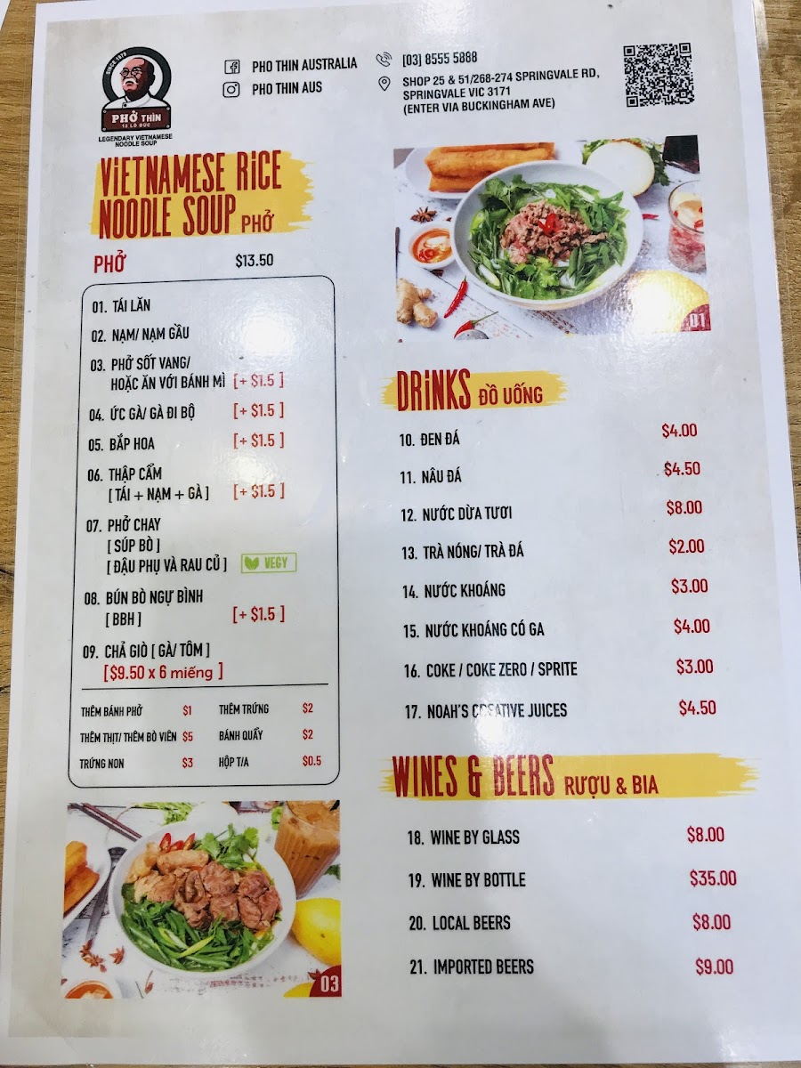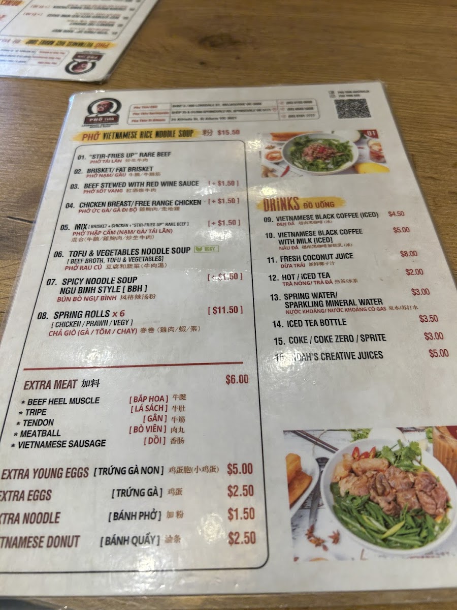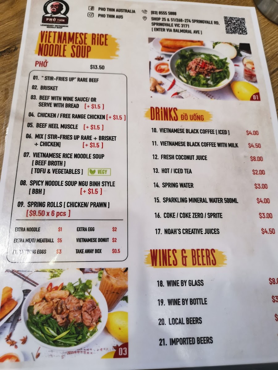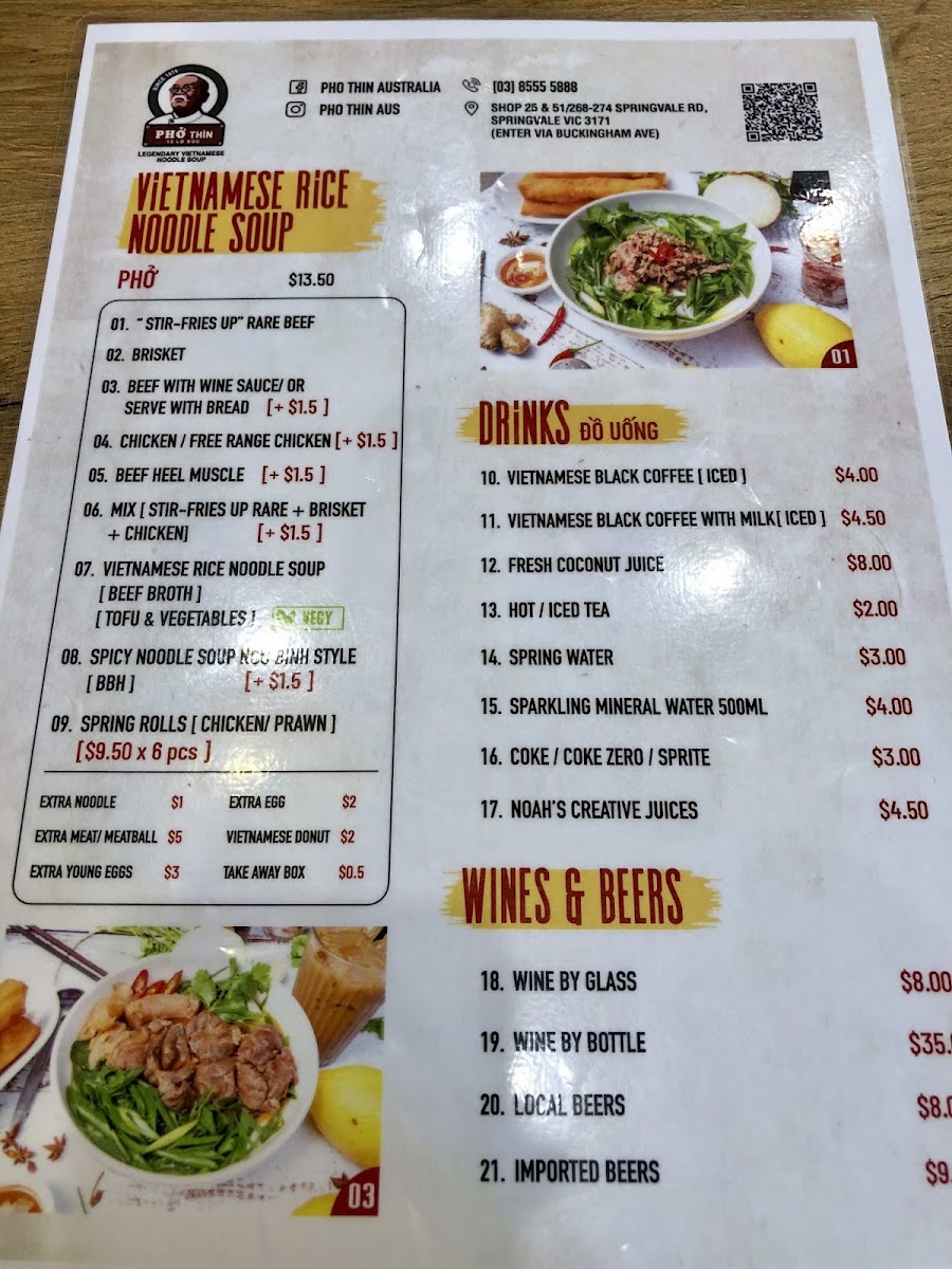 Pho Thin Springvale offers a diverse and flavorful menu, perfect for those craving authentic Vietnamese dishes. Their Single Set Meals include delicious options like Chicken Pho paired with Fresh Coconut Juice, and the hearty Brisket Pho served alongside a refreshing Vietnamese Black Coffee With Milk (Iced). For those seeking something special, the Signature section features the delicious Mix Pho and tender Brisket Pho. The menu also highlights various Pho choices, such as the vegetarian-friendly Tofu and Seasonal Vegetable Pho, the rich Beef Pho with Red Wine, and the comforting Rare Beef Pho and Chicken Pho. Don’t miss out on the Vietnamese Donut for dessert, offering a sweet ending to your meal. For those wanting extra flavor, there are options like Extra Pho, Extra Meat, and house-made sauces like Lemon Chilli, Homemade Chilli Sauce, and Garlic Vinegar. Drinks include refreshing choices such as Sparkling Mineral Water (500ml), classic sodas like Coke, Coke Zero, and Sprite, as well as Hot Tea and Vietnamese Black Coffee With Milk (Iced) to complete your meal.