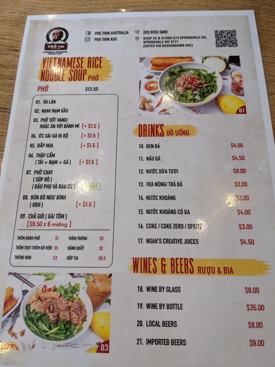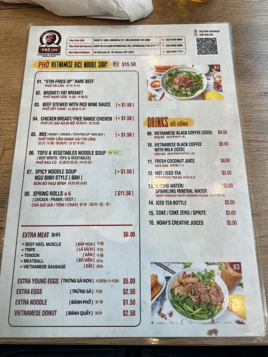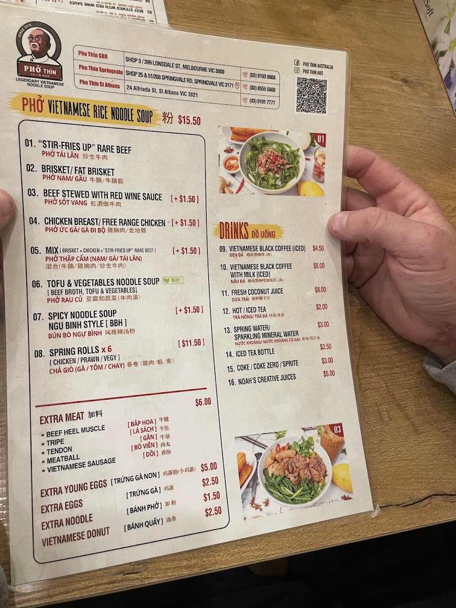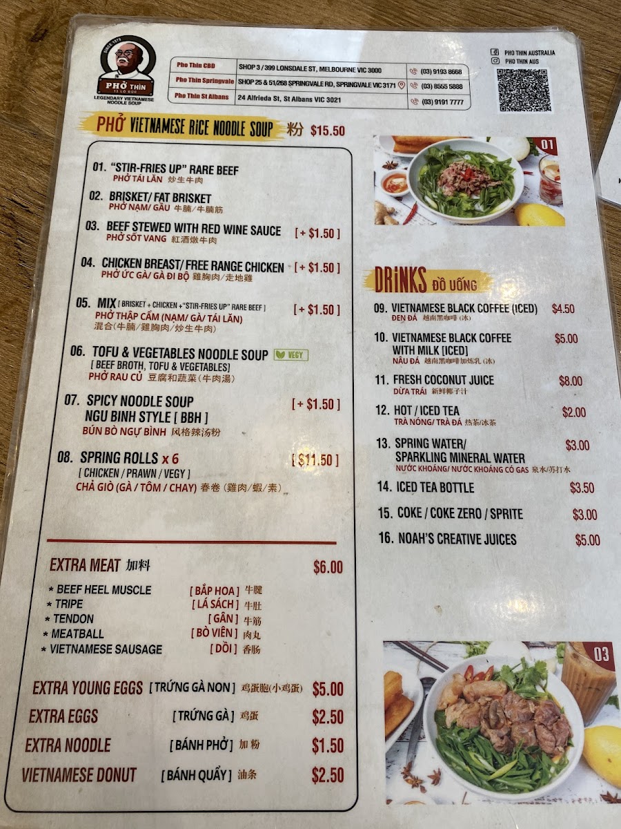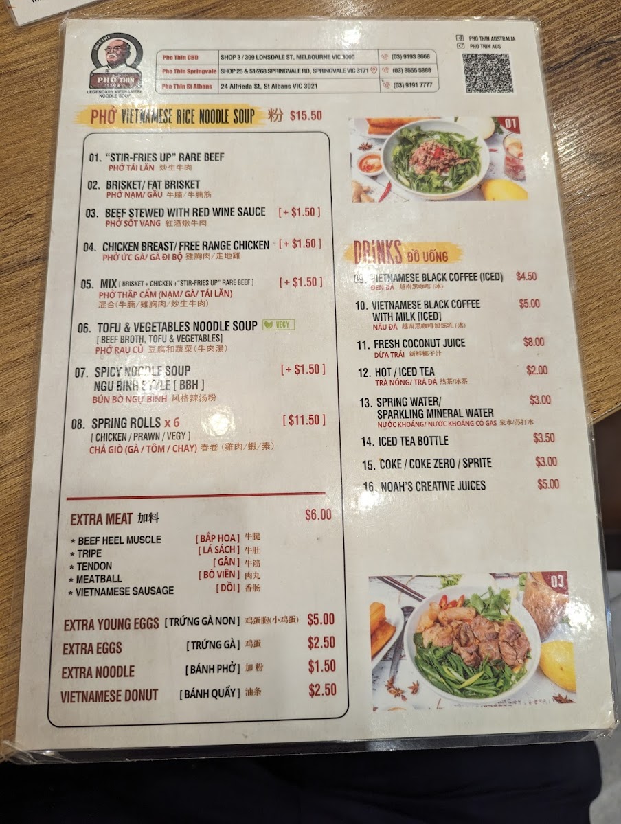 Pho Thin Springvale offers a diverse and flavorful menu, perfect for those craving authentic Vietnamese dishes. Their Single Set Meals include delicious options like Chicken Pho paired with Fresh Coconut Juice, and the hearty Brisket Pho served alongside a refreshing Vietnamese Black Coffee With Milk (Iced). For those seeking something special, the Signature section features the delicious Mix Pho and tender Brisket Pho. The menu also highlights various Pho choices, such as the vegetarian-friendly Tofu and Seasonal Vegetable Pho, the rich Beef Pho with Red Wine, and the comforting Rare Beef Pho and Chicken Pho. Don’t miss out on the Vietnamese Donut for dessert, offering a sweet ending to your meal. For those wanting extra flavor, there are options like Extra Pho, Extra Meat, and house-made sauces like Lemon Chilli, Homemade Chilli Sauce, and Garlic Vinegar. Drinks include refreshing choices such as Sparkling Mineral Water (500ml), classic sodas like Coke, Coke Zero, and Sprite, as well as Hot Tea and Vietnamese Black Coffee With Milk (Iced) to complete your meal.